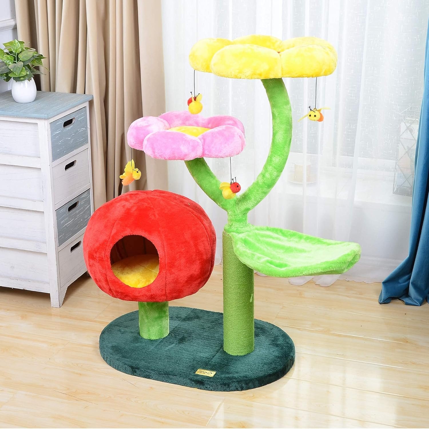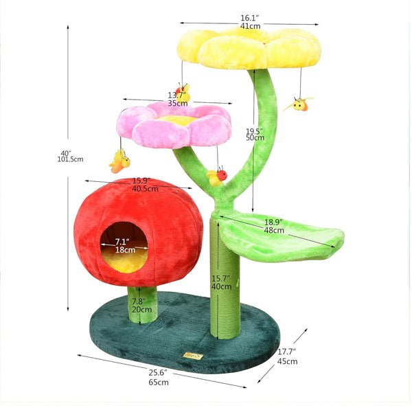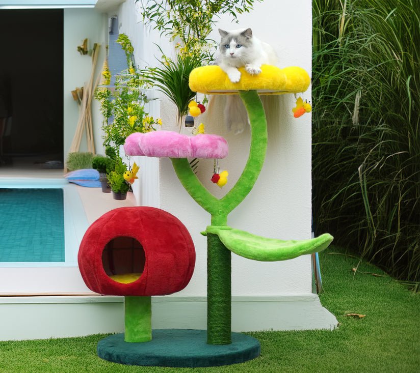 The Catry Flower Cat Tree is a stylish, multi-level cat tower designed for play, rest, and scratching. Featuring plush flower perches, a cozy hammock, and interactive bee toys, it keeps cats entertained. The durable sisal scratching post promotes healthy claws, while the sturdy structure ensures stability. Easy to assemble and clean, this modern cat tree blends seamlessly into any home décor.